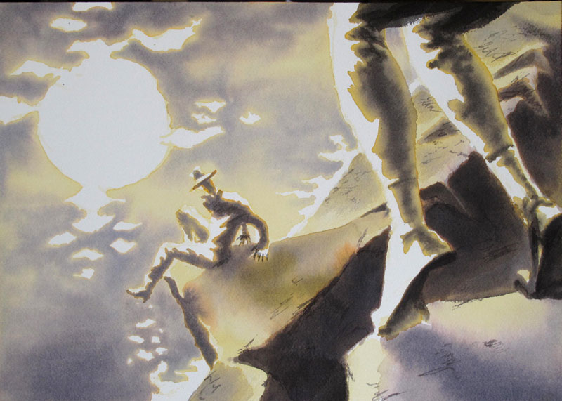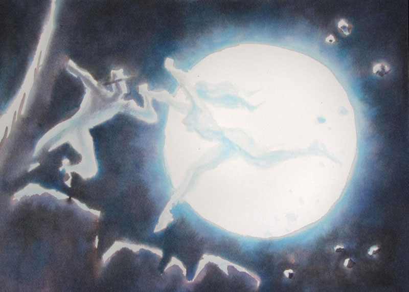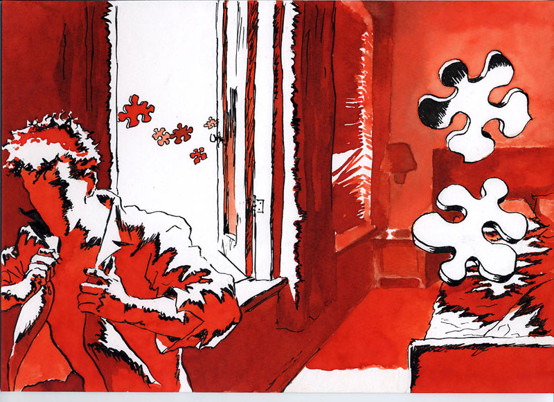En wat valt op? Dit zijn niet de superbekende liedjes. Neen, we krijgen er een aantal die niet direct zo heel bekend in de oren klinken. Maar dat laat toe om ze te lezen zonder vooroordeel (beste vrienden, lezen jullie dit?) waarbij de tekeningen een interpretatie geven van elke tekstregel. En Theo Bogart doet dit uitstekend. De gekozen liedjes zijn: Moonlight, Simple twist of fate, Winterlude, When the ship comes in, Can't wait en I'll be your baby tonight. Dan eens krijgen we een liedje in eenzelfde tekenstijl en techniek, dan weer een liedje met vlugge afwisseling in stijl en techniek. Maar dit is allemaal wel doordacht. Er zit een systematiek in, waarbij de schakelingen in de sfeer van het liedje prachtig gevolgd worden door deze veranderingen in beeldvorming. Theo Bogart slaagt er in om de sterke kanten van verschillende methodes succesvol in te zetten om de kracht van het liedje te tonen. Bij Moonlight gebruikt hij waterverf waarbij hij vooral speelt met licht en kleur en hierdoor zeer sterk een gevoel, een atmosfeer weet weer te geven, terwijl de lijntekeningen in cartoonstijl vooral de humor van de tekst laten zien. In Simple twist of fate is hij soberder en gebruikt hij een beperkt aantal kleuren (zwart, wit en rood), die de lijntekeningen tot leven brengen. De twist in het verhaal valt samen met het introduceren van de waterverf. Van een mooi geordend leventje naar de chaos, perfect weergegeven door deze veranderde techniek en kleurgebruik. En zo krijgen we beelden die het ritme van het boek en het liedje prachtig volgen en weergeven. Hoe Bogart er in slaagt om de andere liedjes te vertalen naar beeld, moet je zelf maar ontdekken.. en wat een ontdekkingsreis staat je nog te wachten!